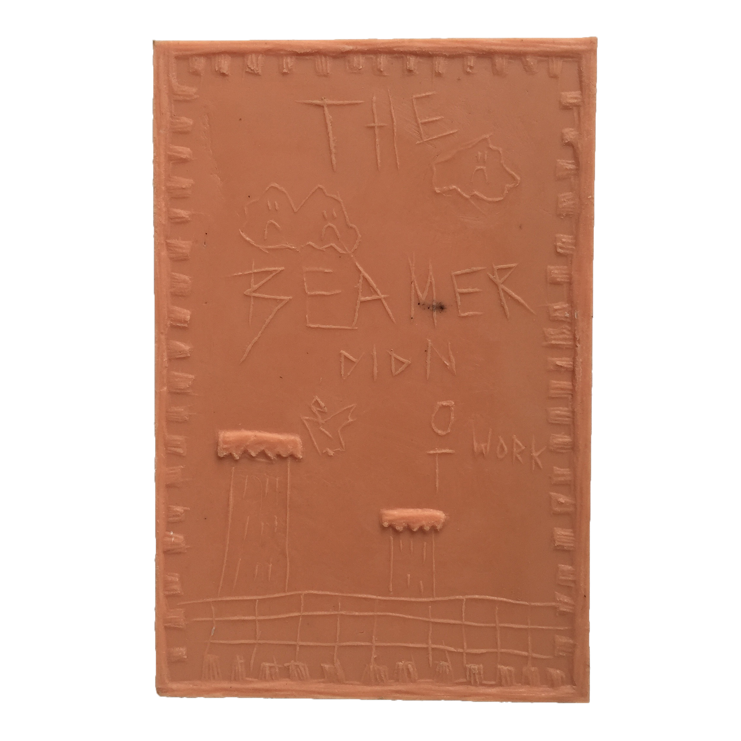 He brought his tomato paste from home (2021) and The beamer did not work (2021) are the titles of Berlin-based artist Carlotta Lücke’s recent works. Small (33x21cm), salmon-coloured composites, made out of MDF boards and silicone. To create these, Carlotta first carves her drawings into the MDF boards to then fill the removed parts with liquid silicone (inverted woodcut). Before hardening, she presses another MDF board on top, to make it the new backside of the work. After the silicone between the boards has solidified, she removes the front board, the negative, to obtain the positive, the new silicone imprint of the drawing, sticking to its wooden backside. Because of the lack of perspectival depth and the addition of words, text, and smileys, the works’ appearances resemble children’s drawings, in which one can encounter sad clouds, or short phrases, picked up from everyday experiences. The respective titles, written in uneven capitals, are integrated into, or rather constitutional elements of the works, as they’re taking up much space in each drawing. The combination of a short trope, pulled out of the everyday and a ‘simplistic’ image make them resemble (macro-)memes, or, as I call them, analogue memes. Like digital ones, analogue memes are erratic in their clarity and complex in their ‘two-dimensional’ flatness. Both only appear relatable to us, because of shared cultural codes, which are equally responsible for making the surface of our everyday (commonly) legible.2